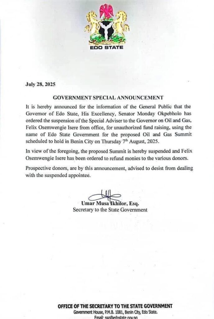 Edo State is reeling from the bombshell announcement: Senator Monday Okpebholo has suspended his Special Adviser on Oil and Gas, Felix Osemwengie Isere, over explosive allegations of unauthorised fundraising and financial misconduct linked to a high-profile oil and gas summit. The move, announced Tuesday by the Secretary to the State Government, Umar Ikhilor, paints a damning picture of selfish ambition and unchecked greed at the very heart of the administration.
